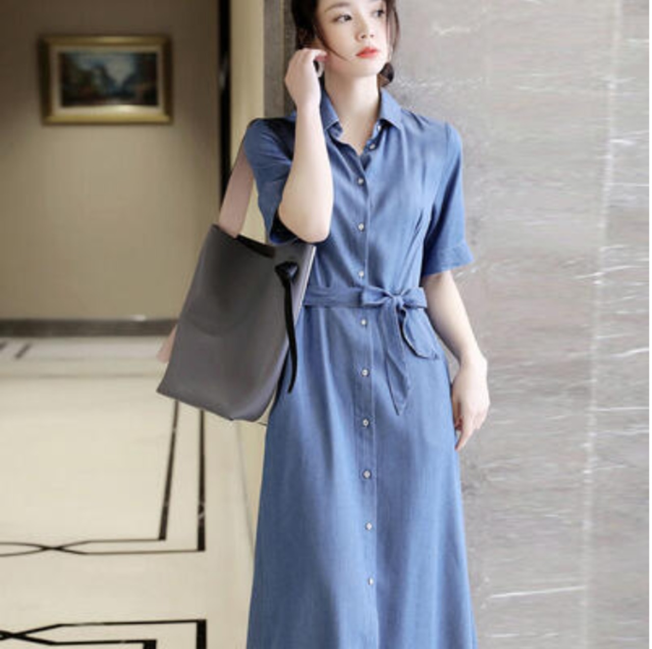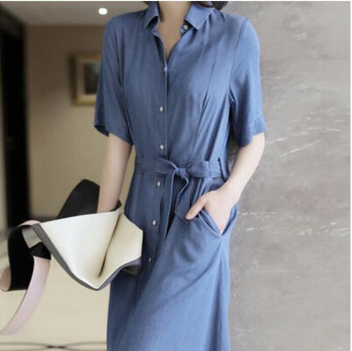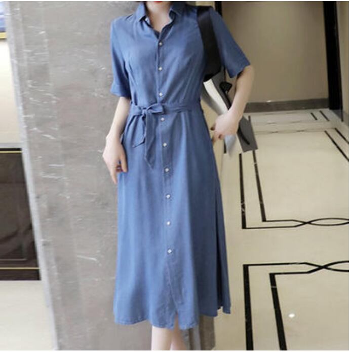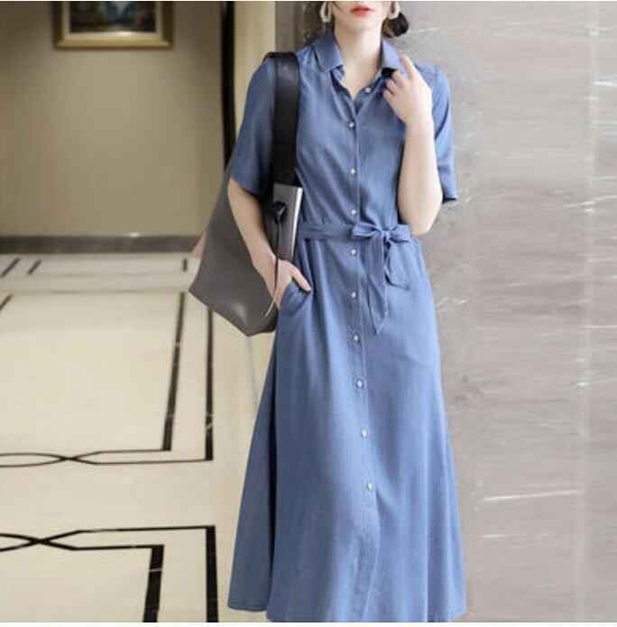 可愛い ウエストリボン ロングワンピース コーデワンピース ミモレ丈 きれいめ カジュアル おしゃれ 夏 半袖 レディース ワンピ ドレス Aライン フェミニン デニム 薄手 涼しい ダンガリー 体型カバー シャツワンピ お出かけ オフィス 大きいサイズ 春夏 秋 ブルー 青 20代 30代 40代 50代