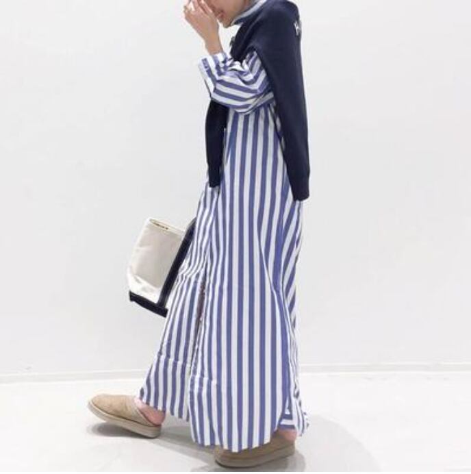 きれいめ フェミニン 体型カバー ロングワンピースワンピース ロング丈 カジュアル 春 夏 袖あり マキシ丈 シャツワンピ ストライプ 長袖 おしゃれ レディース 春夏 秋 可愛い ワンピ ドレス 抜け感 シンプル ゆったり こなれ感 ナチュラル コーデ ブルー 20代 30代 40代 50代