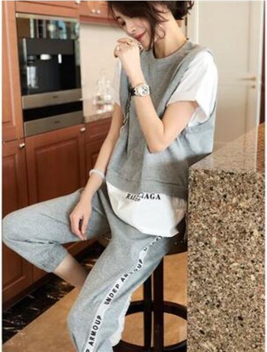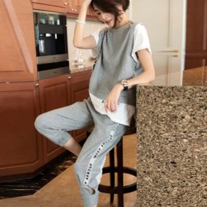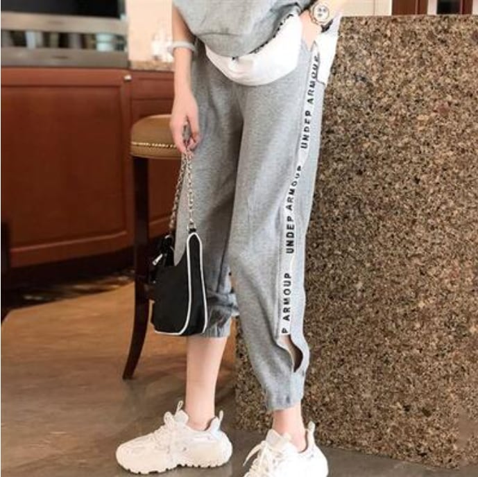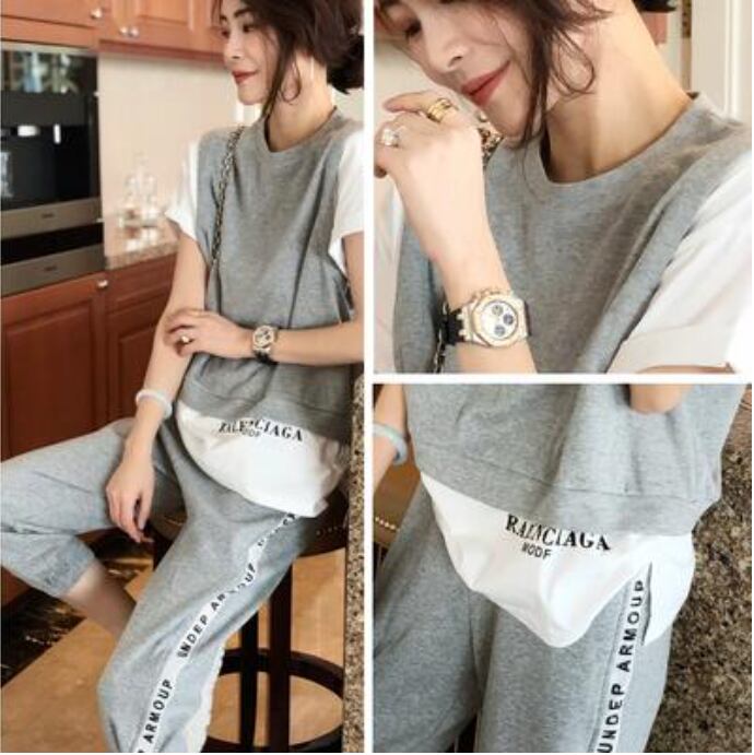 大きいサイズ XL 2XLセットアップ 2点セット レディース カジュアル スポーティー おしゃれ パンツセット スウェット ロング丈 ロゴ Tシャツ カットソー かっこいい 半袖 レイヤード風 楽ちん リラックス 春 夏 グレー 20代 30代 40代 50代