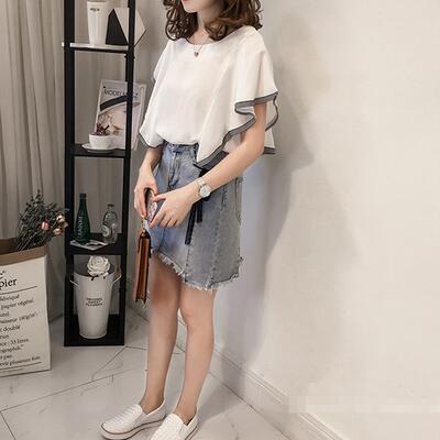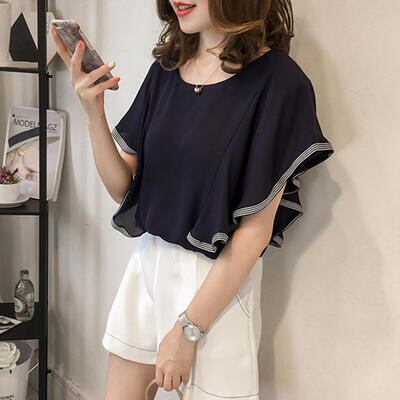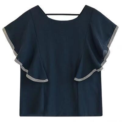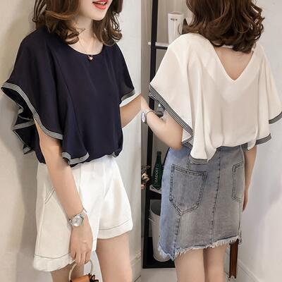 全2色 ゆったり フェミニン シャツトップス レディース カットソー Tシャツ きれいめ カジュアル 半袖 ブラウス おしゃれ 可愛い フレアスリーブ 涼しい シンプル ナチュラル Vネック オフィス 大きいサイズ ホワイト 白 ネイビー 春 夏 秋 20代 30代 40代 50代