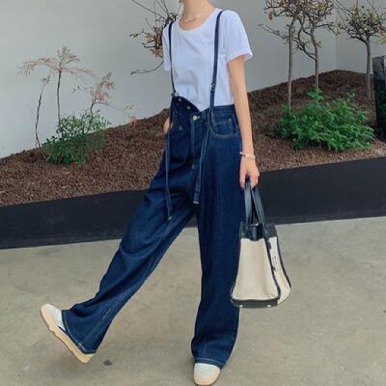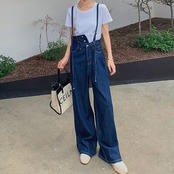 ボーイッシュに着こなせるデニムのサロペットパンツと白Tシャツのセット。