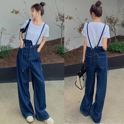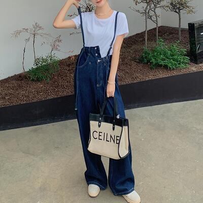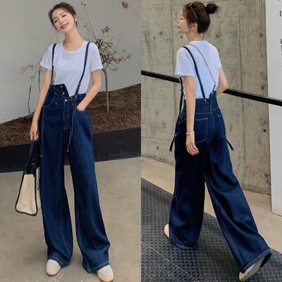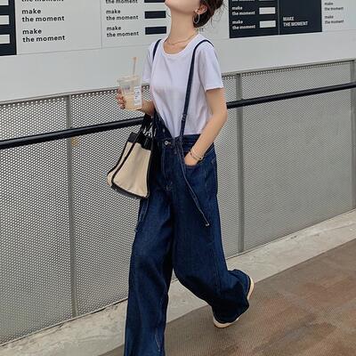 セットアップ 2点セット サロペットパンツ パンツ デニム オーバーオール ロング丈 Tシャツ 半袖 カジュアル おしゃれ 夏 レディース オールインワン 可愛い アシンメトリー かっこいい 春 春夏 秋 ゆったり フェミニン ブルー ホワイト 白 20代 30代 40代 50代