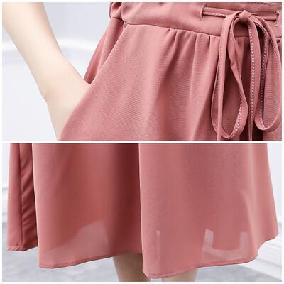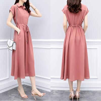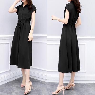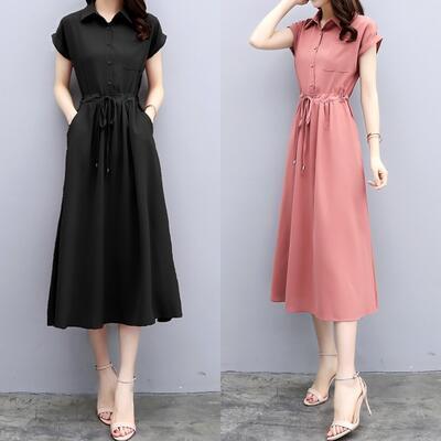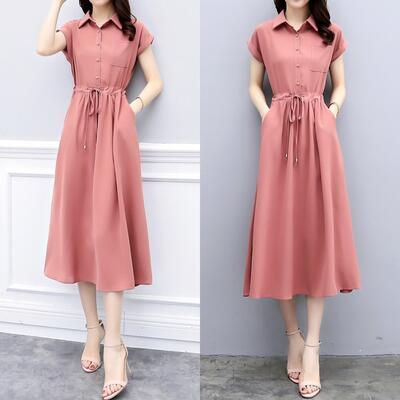 全2色 ワンピース ミモレ丈 エレガント カジュアル 春 夏 半袖 おしゃれ レディース 春夏 秋 可愛い ワンピ ドレス シャツワンピ シンプル きれいめ フェミニン Aライン ハイウエスト ウエストリボン ナチュラル ピンク ブラック 黒 大きいサイズ 20代 30代 40代 50代