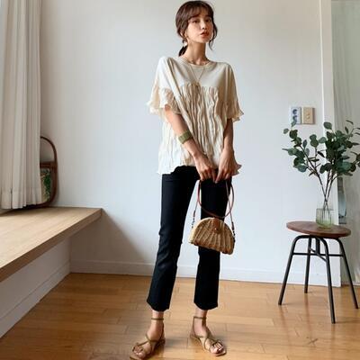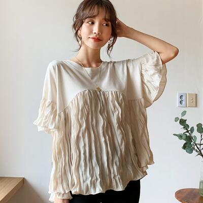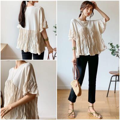 全3色 エレガント 上品 体型カバー ナチュラルトップス レディース プリーツ シワ加工 Tシャツ きれいめ カジュアル 半袖 ブラウス カットソー かわいい 二の腕カバー フェミニン シンプル ベージュ ホワイト 白 ブラック 黒 春 夏 秋 20代 30代 40代 50代