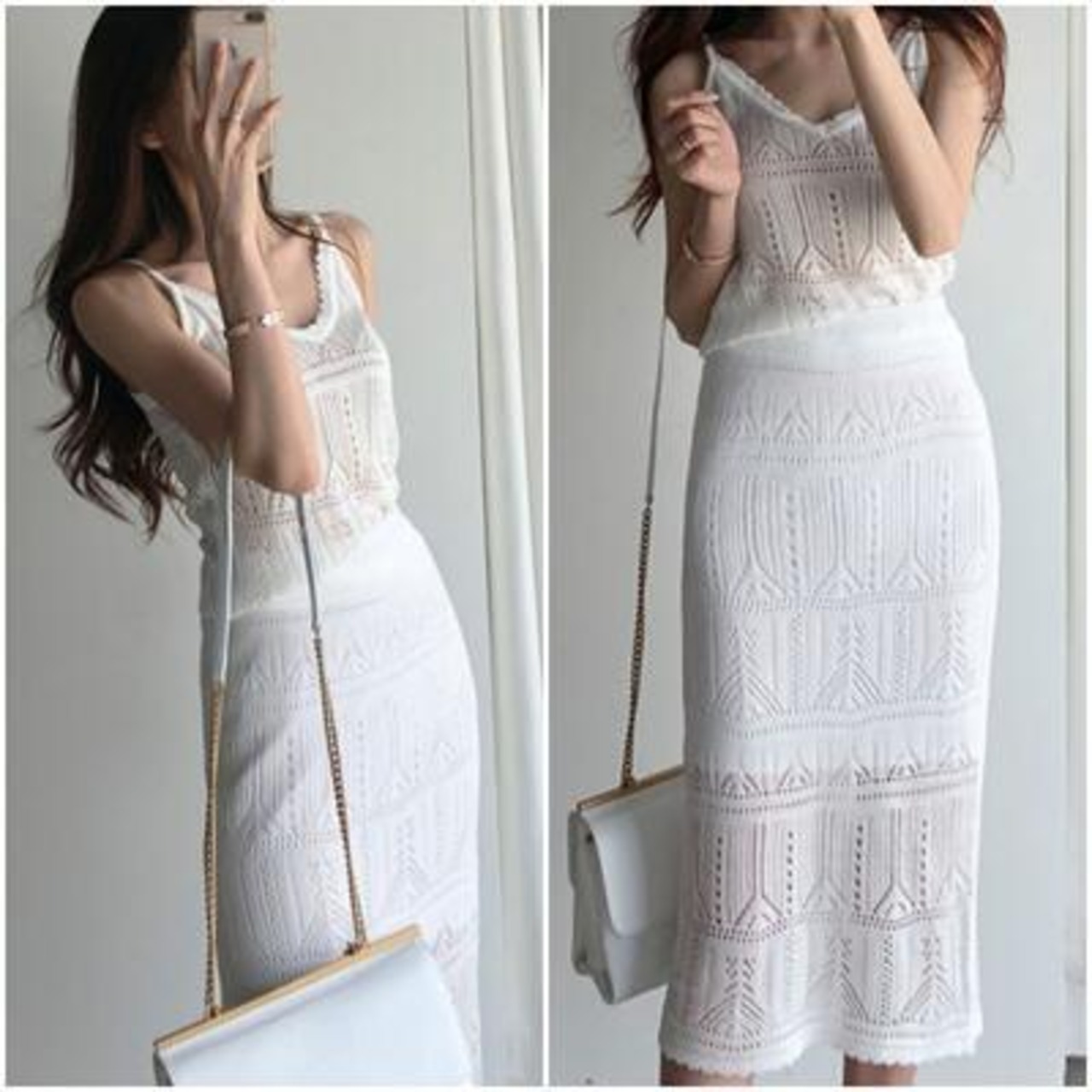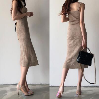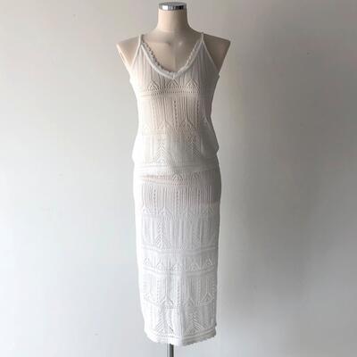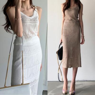 全2色 フェミニン おしゃれ 上下セットセットアップ 2点セット レディース スカートセット レース キャミソール カジュアル トップス スカート ミモレ丈 ノースリーブ タイト シンプル 透け感 きれいめ ウエストゴム 可愛い ホワイト 白 ブラウン 春 夏 20代 30代 40代 50代