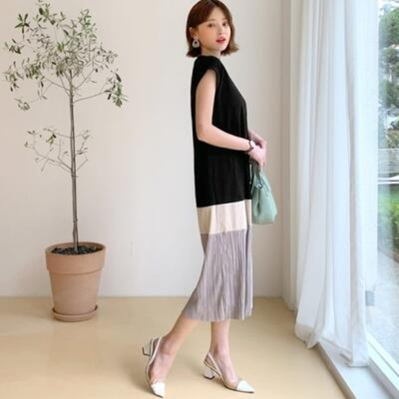 異素材の切り替えがおしゃれなマルチカラーワンピース。