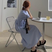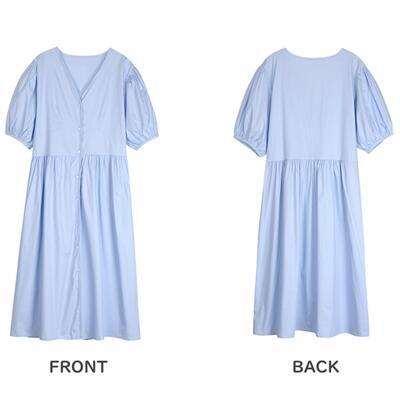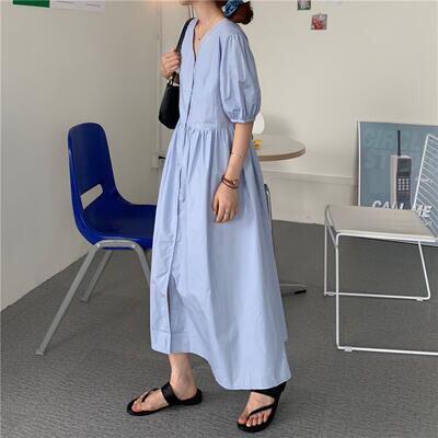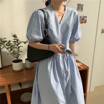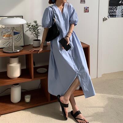 ワンピース ミモレ丈 袖あり きれいめ カジュアル 半袖 パフスリーブ おしゃれ 夏 レディース 可愛い ワンピ ドレス Aライン フェミニン ハイウエスト シャツワンピ ロングワンピ ボタン Vネック ナチュラル シンプル こなれ感 春夏 秋 ブルー 20代 30代 40代 50代