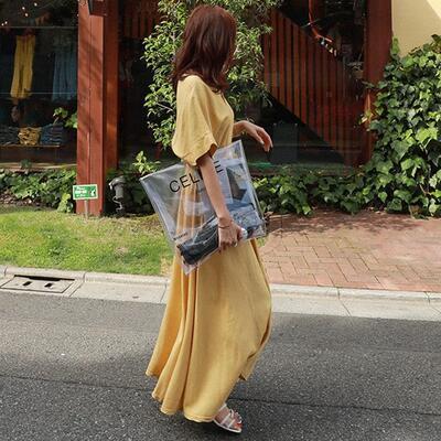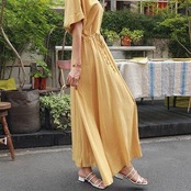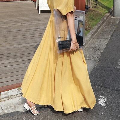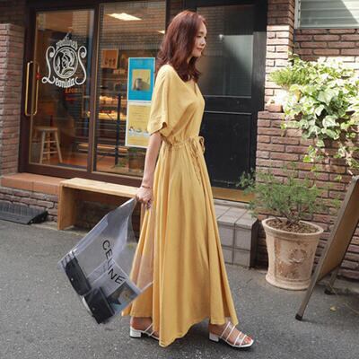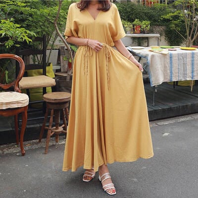 リネン ワンピース ナチュラル 涼しい コットン リネン混 綿 麻 半袖 マキシ丈 ロングワンピ 体型カバー ゆったり 春 夏 春夏 カジュアル おしゃれ レディース ワンピ ドレス シンプル フェミニン ドロスト Vネック ハイウエスト リゾート イエロー 20代 30代 40代 50代