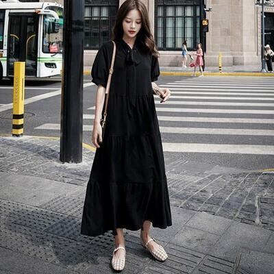 ゆったり 体型カバー 可愛い ロングワンピースティアード ワンピース レディース カジュアル おしゃれ 袖あり パフスリーブ きれいめ リボン ロング丈 ワンピ ドレス 半袖 シンプル ナチュラル 着痩せ フェミニン大きいサイズ ブラック 黒 春 夏 秋 20代 30代 40代 50代