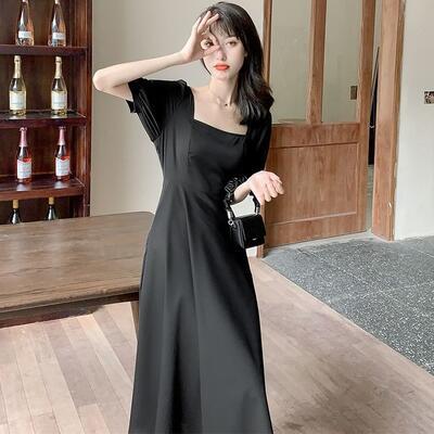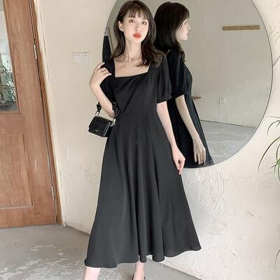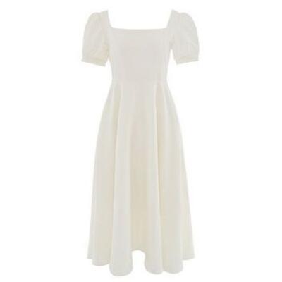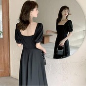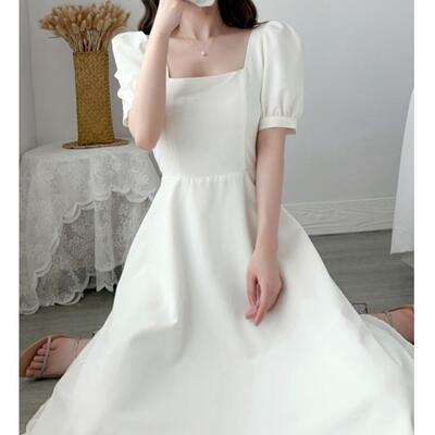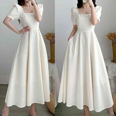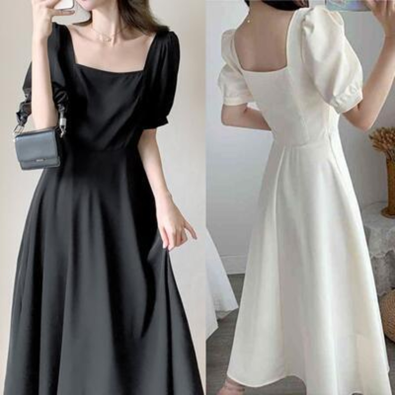 全2色 Aライン スクエアネック エレガント結婚式 ワンピース 袖あり ミモレ丈 きれいめ カジュアル おしゃれ パフスリーブ ワンピ ドレス 半袖 オケージョンワンピース フェミニン シンプル パーティー 二次会 ホワイト 白 ブラック 黒 大きいサイズ 2XL 3XL 20代 30代 40代 50代
