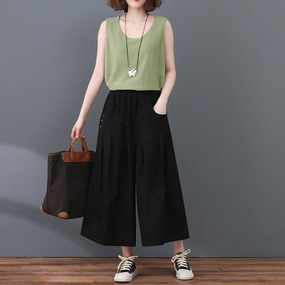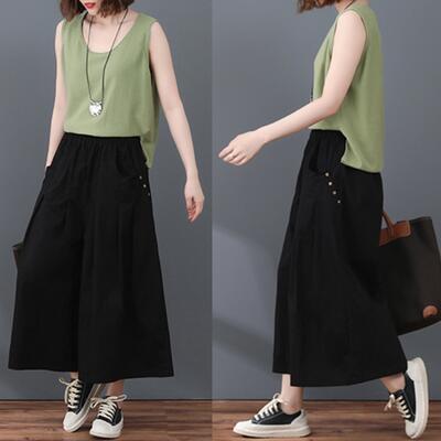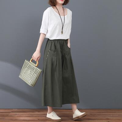 全3色 おしゃれ 可愛い フェミニン 下半身カバーワイドパンツ レディース カジュアル パンツ フレア ボトムス ワイドレッグ ガウチョ ウエストゴム リラックス ゆったり 体型カバー シンプル 大きいサイズ XL 2XL カーキ グリーン ブラック 黒 春 夏 秋 20代 30代 40代 50代