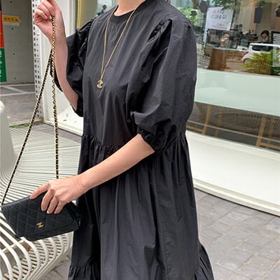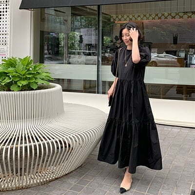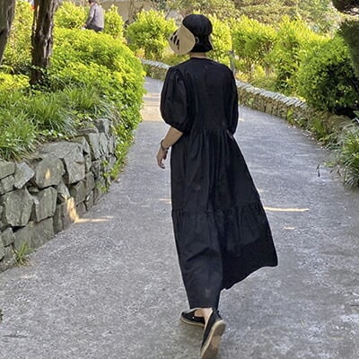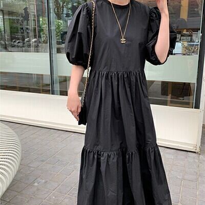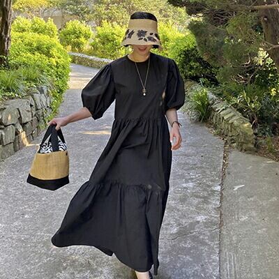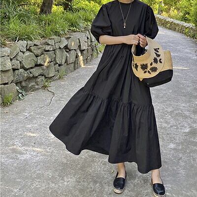 ゆったり 体型カバー コーデ パフスリーブ ワンピース コットン 綿 半袖 五分袖 カジュアル おしゃれ レディース 可愛い ワンピ ドレス Aライン こなれ感 ブラック 黒 お出かけ 薄手 涼しい ロング丈 ボリューム袖 フレア 春 夏 秋 20代 30代 40代 50代