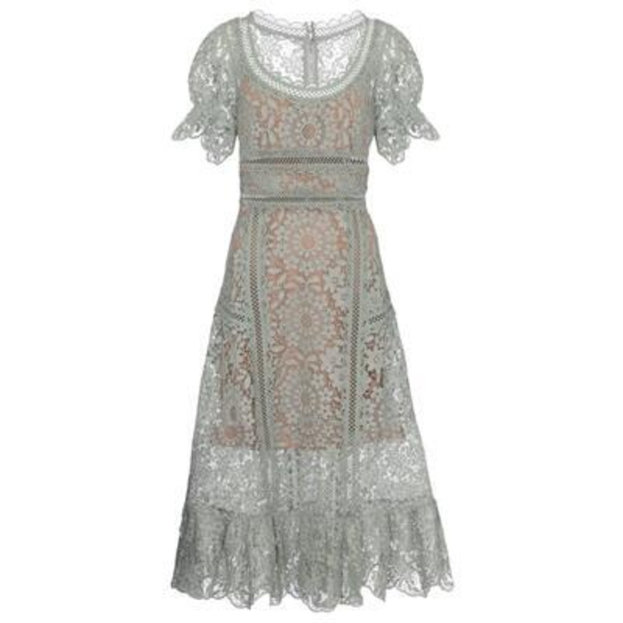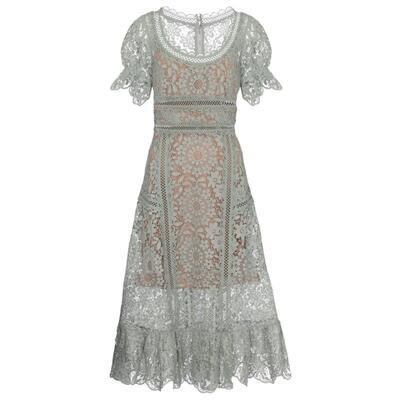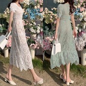全2色 ティアード ワンピース レディース レース 袖あり 夏 カジュアル おしゃれ きれいめ 半袖 パフスリーブ 可愛い ワンピ ドレス ミモレ丈 フェミニン クラシカル Aライン ハイウエスト お呼ばれ 春夏 秋 グリーン ホワイト 白 20代 30代 40代 50代