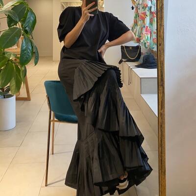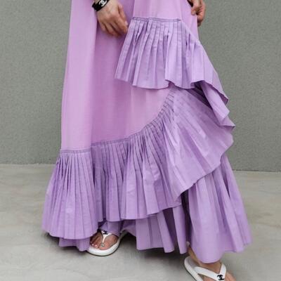 大きなフリルが印象的なワンピース。
