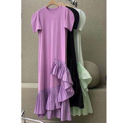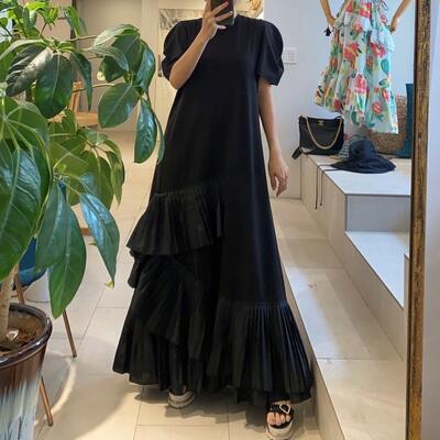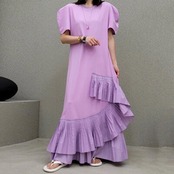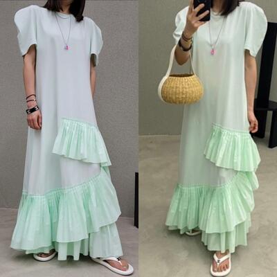 全3色 ワンピース レディース 袖あり エレガント カジュアル おしゃれ きれいめ 半袖 可愛い ワンピ ドレス パフスリーブ マキシ丈 フェミニン フリル ロングワンピ お呼ばれ リゾート グリーン パープル ブラック 黒 春 夏 秋 20代 30代 40代 50代