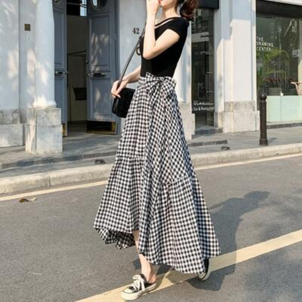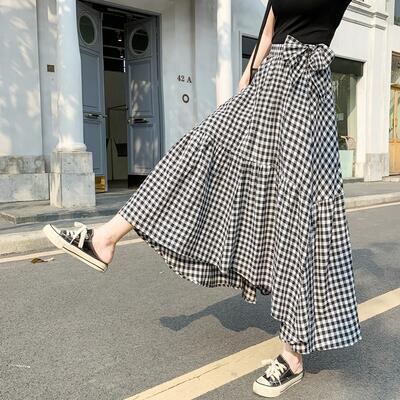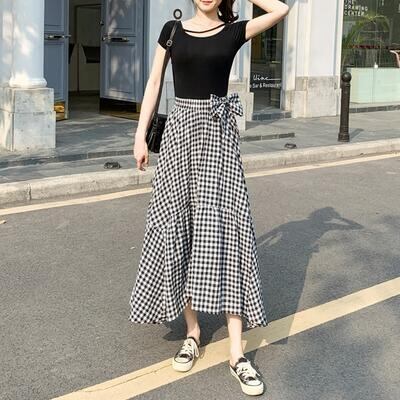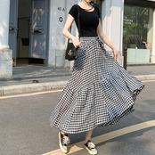 ティアード スカート ギンガムチェック きれいめ エレガント カジュアル おしゃれ レディース ミモレ丈 アシンメトリー 夏 春夏 フレア リボン フェミニン ボリューム お出掛け 大人可愛い 体型カバー ロングスカート ブラック 黒 20代 30代 40代 50代
