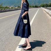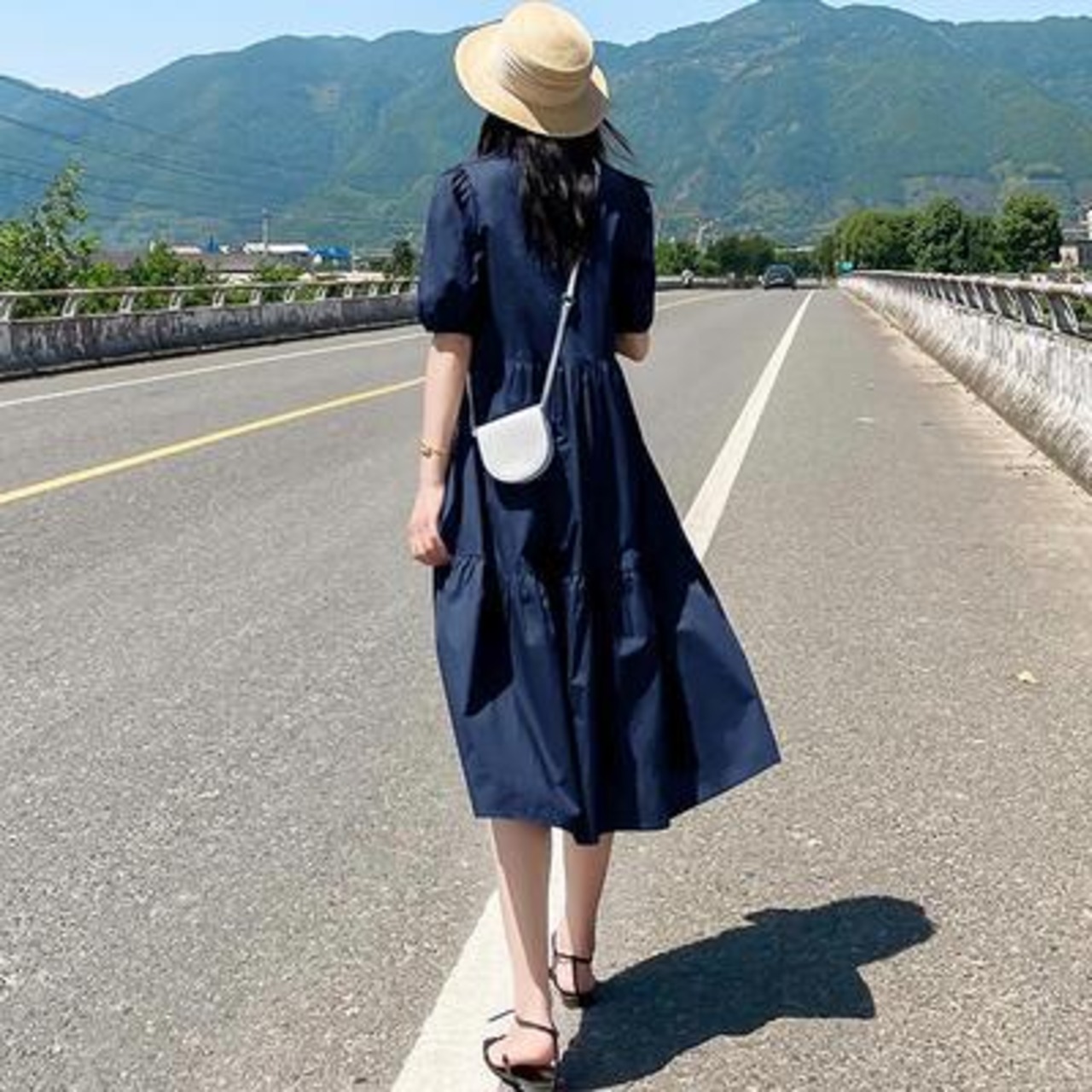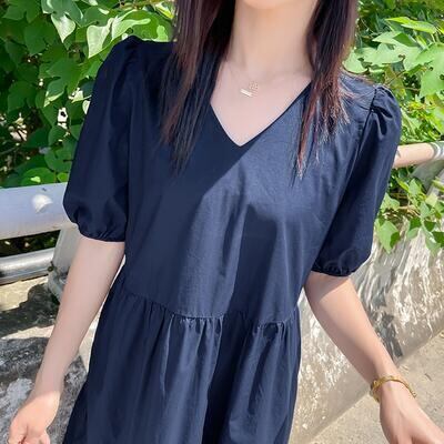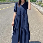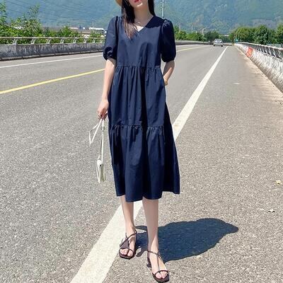 ティアード ワンピース レディース 袖あり 夏 カジュアル おしゃれ きれいめ 半袖 パフスリーブ 可愛い ワンピ ドレス ミモレ丈 フェミニン シンプル Aライン クラシカル ナチュラル Vネック 春夏 秋 大きいサイズ ネイビー 20代 30代 40代 50代