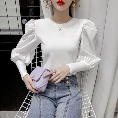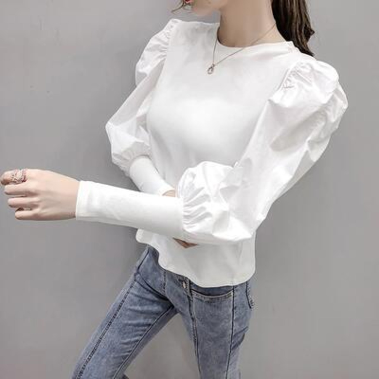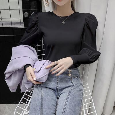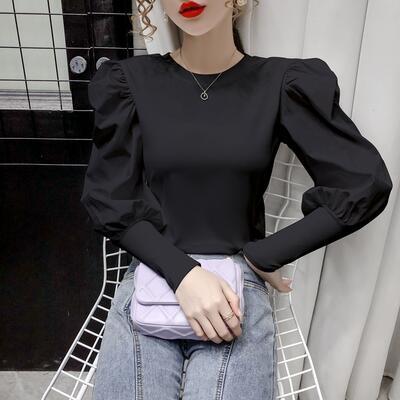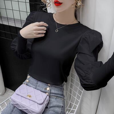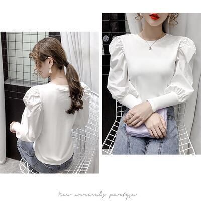 全2色 トップス レディース パフスリーブ カットソー カジュアル 長袖 きれいめ おしゃれ エレガント フェミニン 可愛い Tシャツ クラシカル 二の腕カバー シンプル 大きいサイズ ブラック 黒 ホワイト 白 春 夏 秋 20代 30代 40代 50代