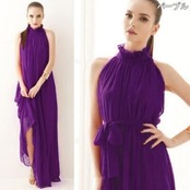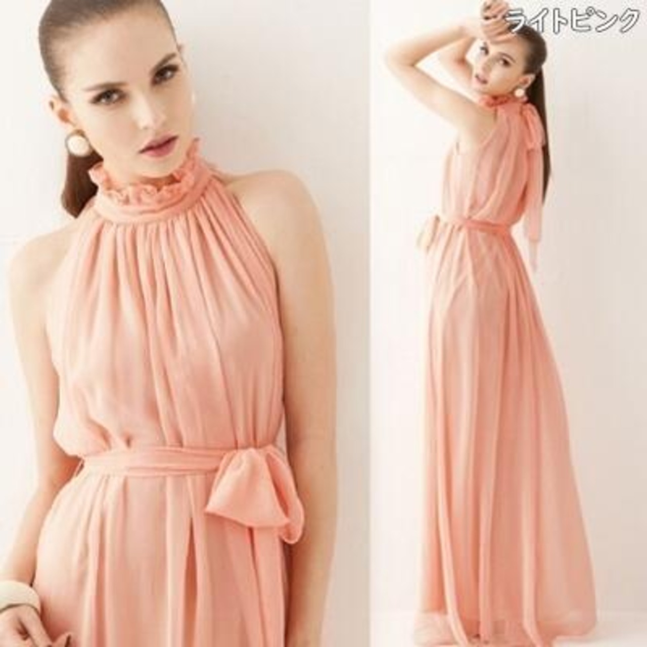 フリルのハイネックがクラシカルな印象のシフォンワンピース。