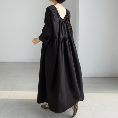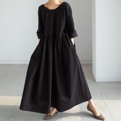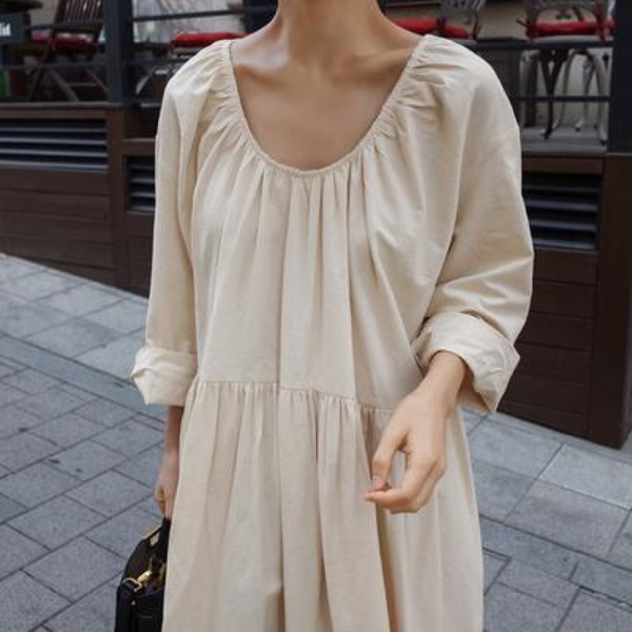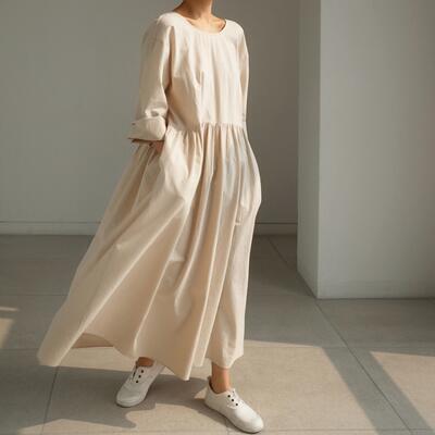 全2色 ワンピース レディース 袖あり 夏 カジュアル おしゃれ きれいめ 長袖 可愛い ワンピ ドレス ロング丈 フェミニン シンプル Aライン クラシカル ナチュラル ゆったり 体型カバー ハイウエスト 春夏 秋 大きいサイズ ベージュ ブラック 黒 20代 30代 40代 50代