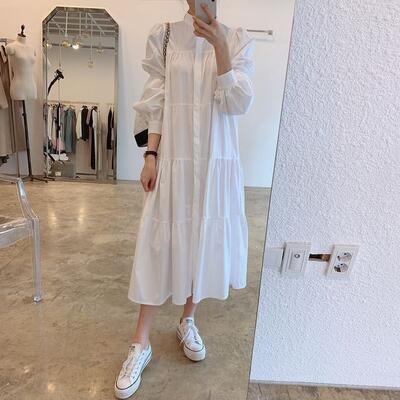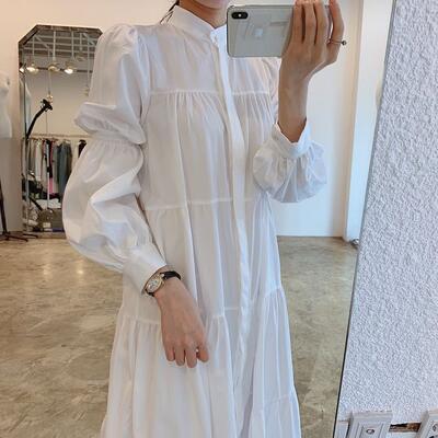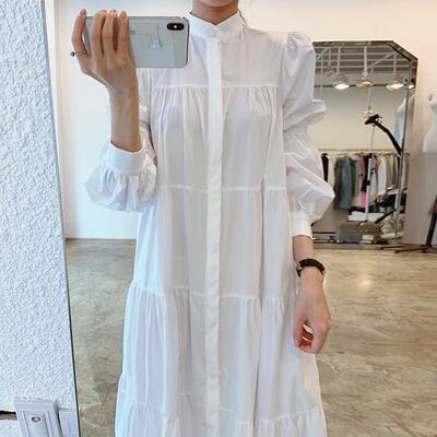 全2色 Aライン クラシカル 可愛い ワンピティアード ワンピース レディース 袖あり カジュアル おしゃれ きれいめ 長袖 ドレス ミモレ丈 フェミニン シンプル ハイネック ナチュラル ゆったり 体型カバー 春 夏 秋 ホワイト 白 ブラック 黒 20代 30代 40代 50代