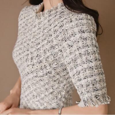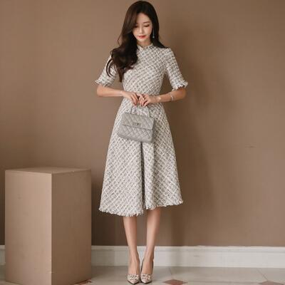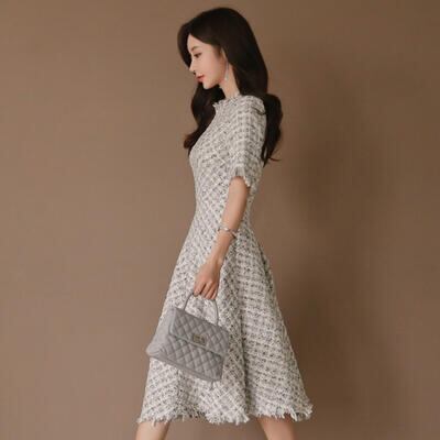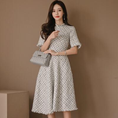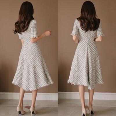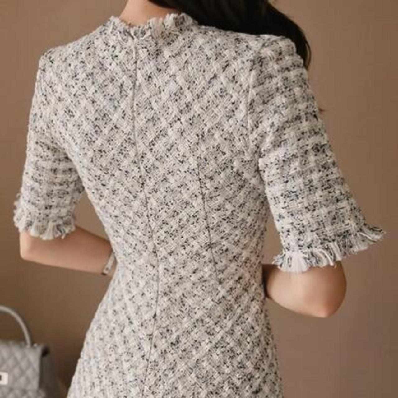 ワンピース ひざ丈 ツイード エレガント カジュアル 半袖 おしゃれ レディース クラシカル 可愛い フェミニン ワンピ ドレス フリンジ ハイウエスト Aライン ミモレ丈 お呼ばれ オフィス 脚長 大きいサイズ 春 夏 秋 20代 30代 40代 50代