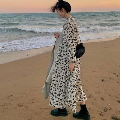 ゆったり ロングワンピ 体型カバー ワンピース カジュアル ミモレ丈 袖あり 小花柄 きれいめ 長袖 おしゃれ レディース フレア 可愛い フェミニン ワンピ ドレス リラックス ナチュラル ホワイト 白 春 夏 秋 20代 30代 40代 50代