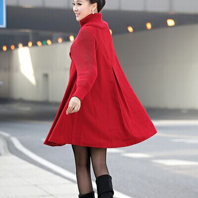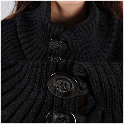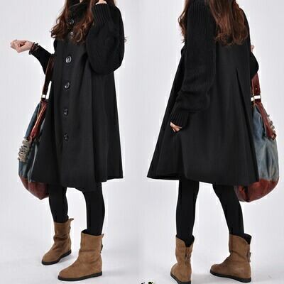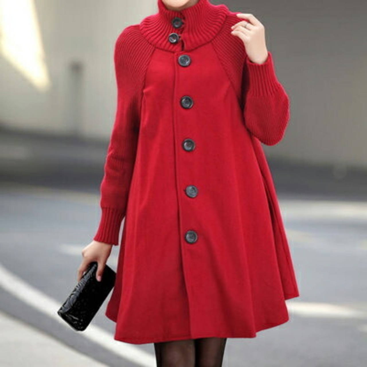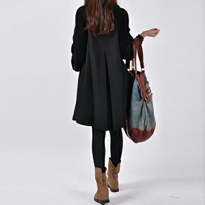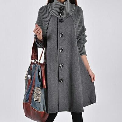 大きめのボタンがアクセント、Aラインのミドル丈コート。