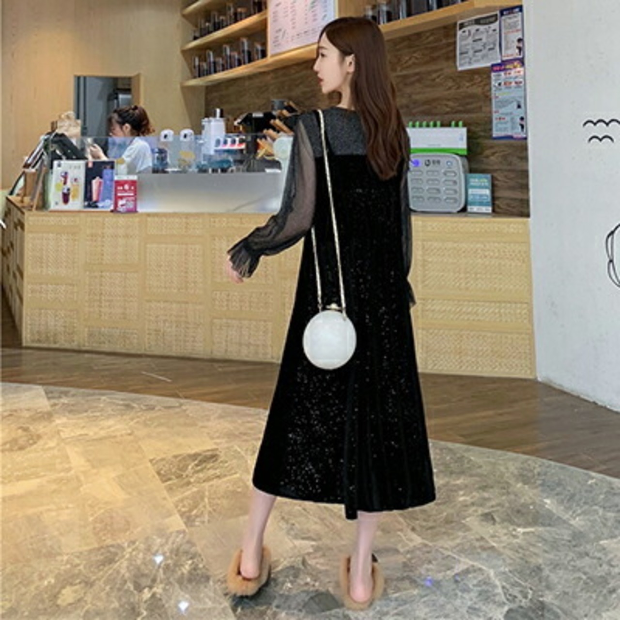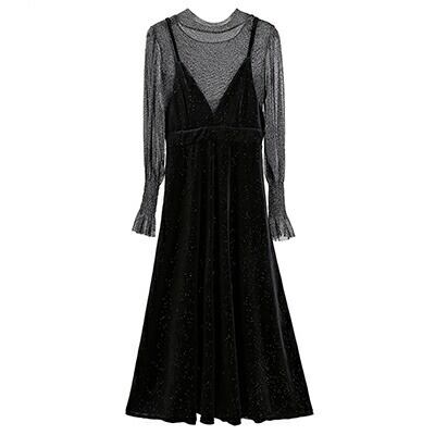 ベルベッドライクな素材とシースルー素材のコンビネーションが魅力のワンピース。