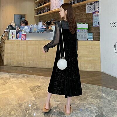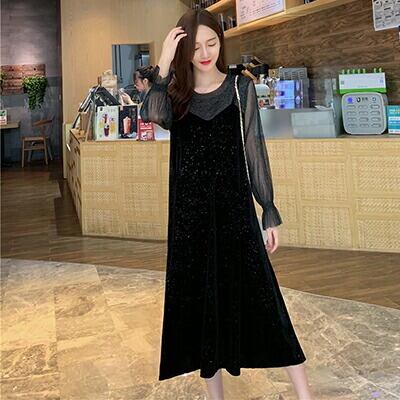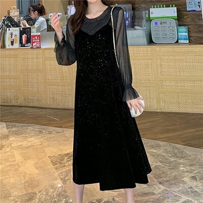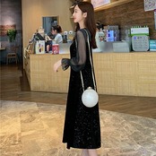 シースルー ベルベッド 大きいサイズワンピース カジュアル ミモレ丈 袖あり きれいめ 長袖 おしゃれ レディース フレア 可愛い フェミニン ワンピ ドレス ゆったり ロングワンピ 体型カバー ブラック 黒 春 夏 秋 20代 30代 40代 50代 XL 2XL 3XL 4XL パーティ お出かけ