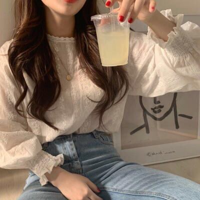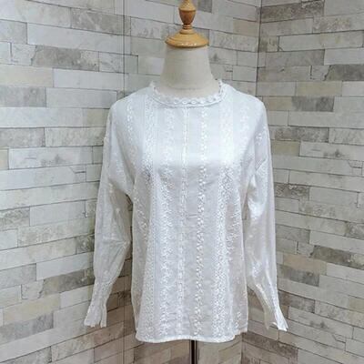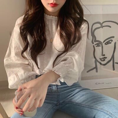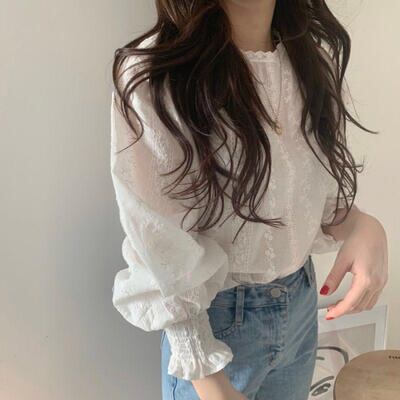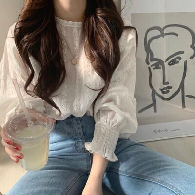 トップス ブラウス シャツ レディース ホワイト シンプル ガーリー ナチュラル きれいめ おしゃれ 刺繍 袖あり ボリューム袖 長袖 コットン 体型カバー 二の腕カバー 春 夏 秋 薄手 涼しい オルチャン 韓国 コーデ 20代 30代 40代 50代