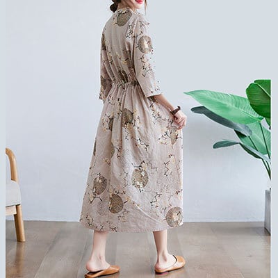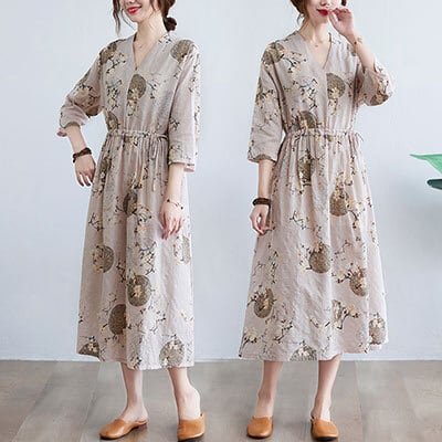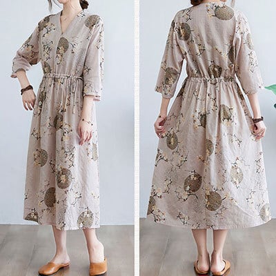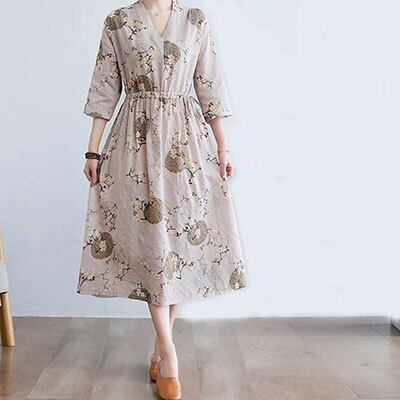 ロングワンピース レディース きれいめ カジュアル ロング丈 ひざ下 ワンピ ベージュ Aライン Vネック ウエストマーク 花柄 ドレス エレガント 上品 袖あり 半端袖 フレア ゆったり 春 夏 秋 韓国 コーデ レトロ おしゃれ 20代 30代 40代 50代