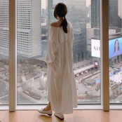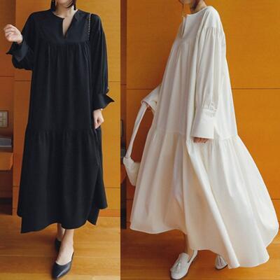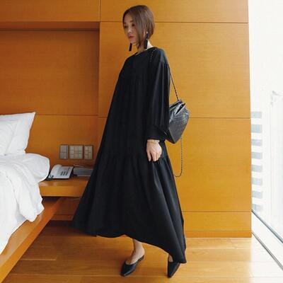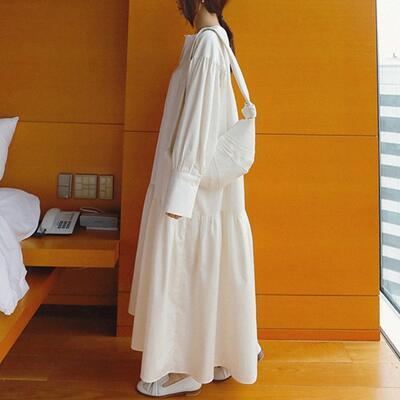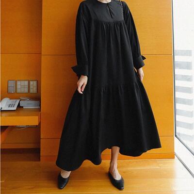 全2色 大きいサイズ ティアード ワンピース カジュアル ロング丈 袖あり シャツワンピース 長袖 おしゃれ レディース 可愛い フェミニン ワンピ ドレス スキッパー ミモレ丈 ゆったり 体型カバー きれいめ シンプル ブラック 黒 ホワイト 白 春 夏 秋 20代 30代 40代 50代