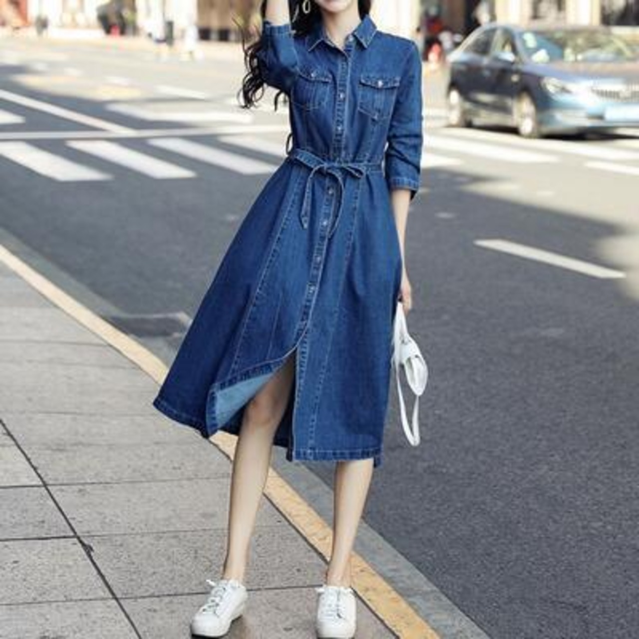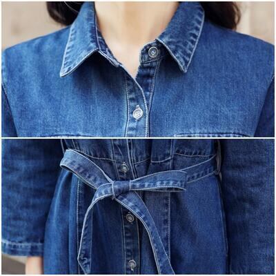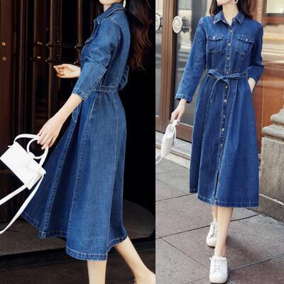 ワンピース カジュアル デニム ミモレ丈 袖あり シャツワンピース 長袖 おしゃれ レディース 可愛い フェミニン ワンピ ドレス ひざ丈 Aライン ウエストリボン きれいめ シンプル ベーシック 大きいサイズ ブルー 白 春 夏 秋 20代 30代 40代 50代