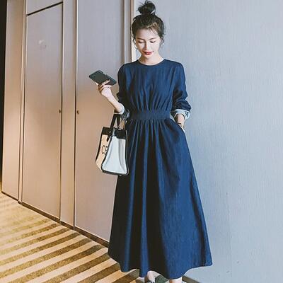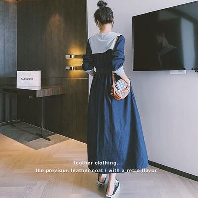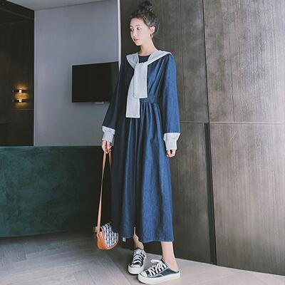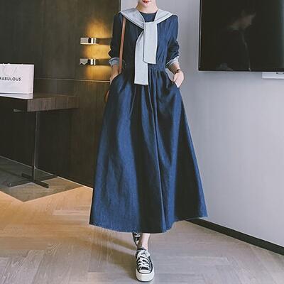 ワンピース カジュアル デニム 袖あり ロング丈 ロングワンピ ショール おしゃれ レディース 可愛い フェミニン ワンピ ドレス 長袖 Aライン シンプル きれいめ ハイウエスト レイヤード 大きいサイズ ブルー 春 夏 秋 20代 30代 40代 50代