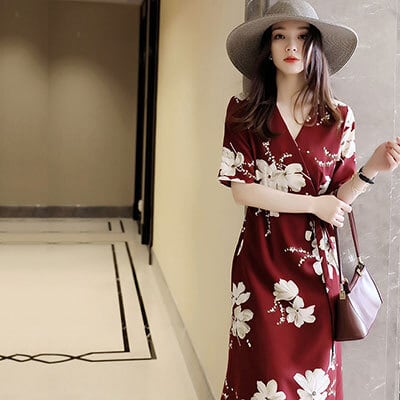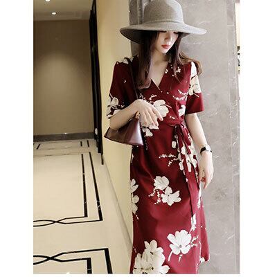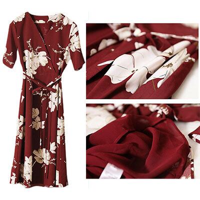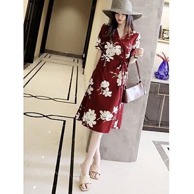 ロングワンピース ドレス 花柄 レディース ひざ下 ミモレ丈 Vネック レッド 赤 袖あり 5分袖 ゆったり 春 夏 秋 韓国 コーデ エレガント 上品 かっこいい こなれ感 カシュクール ウエストマーク 10代 20代 30代 40代 50代