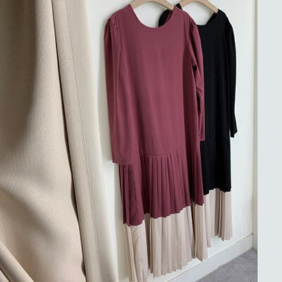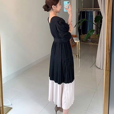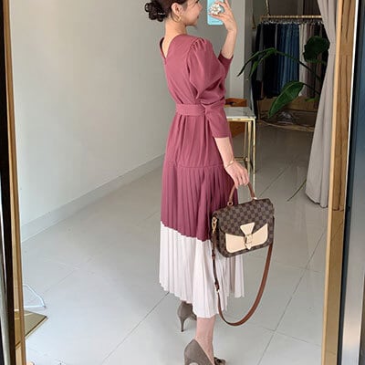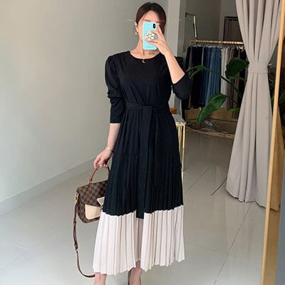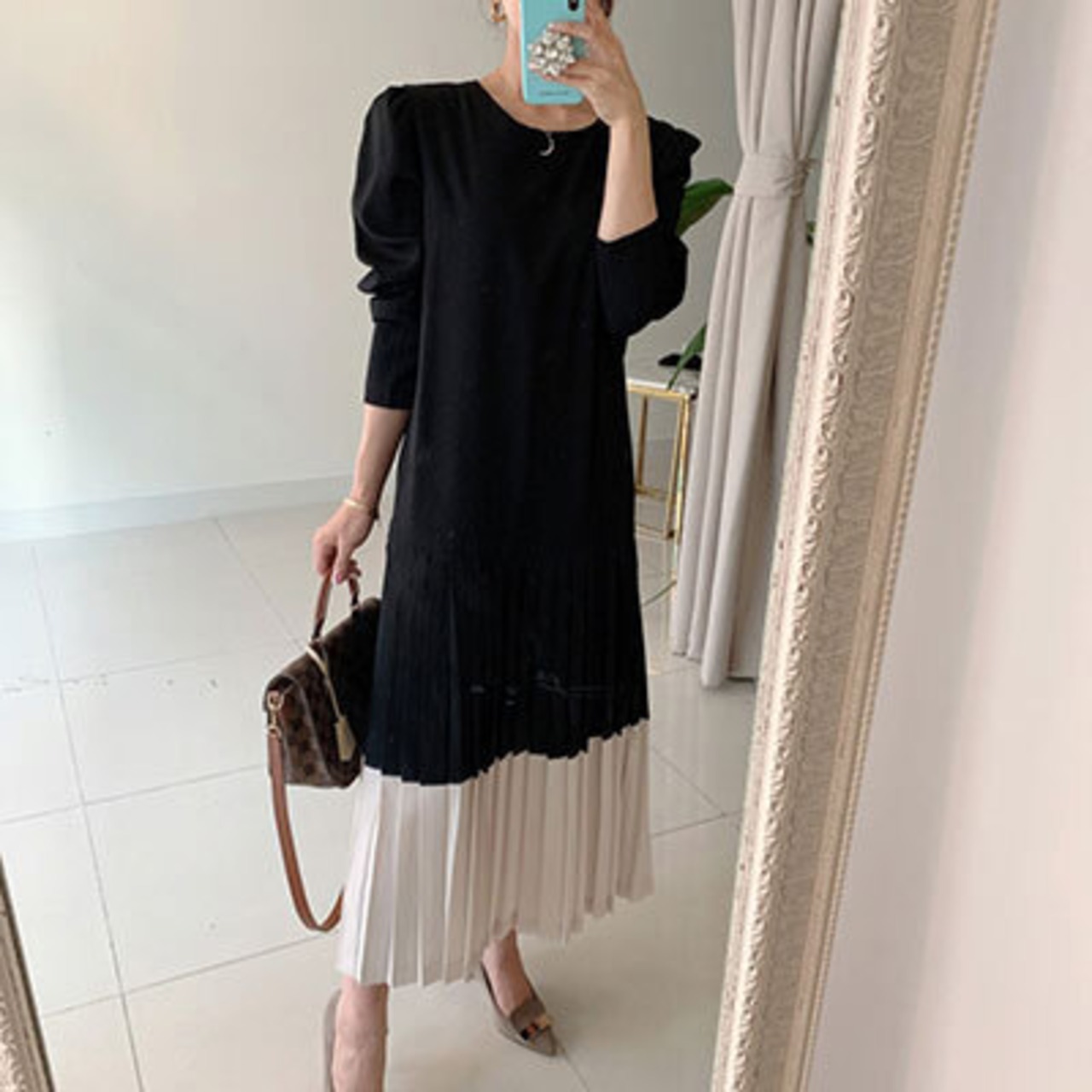 全2色 ナチュラル キレカジ おしゃれ ウエストマークロングワンピース レディース きれいめ カジュアル 袖あり プリーツ ロング丈 ワンピース ドレス シック エレガント コントラストカラー 袖あり 七分袖 韓国 コーデ レッド ピンク ブラック 赤 黒 春 夏 秋 10代 20代 30代 40代 50代