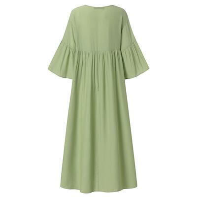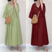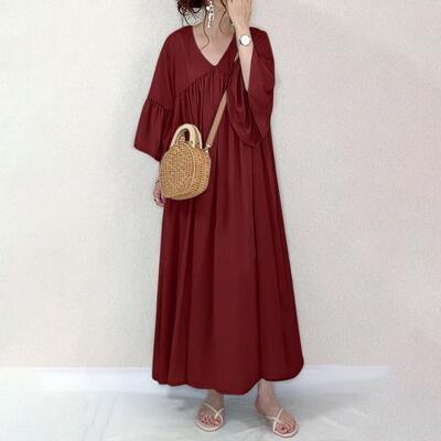 全2色 Aライン Vネック きれいめ ゆったり 体型カバー ワンピース カジュアル ロング丈 フレアスリーブ おしゃれ レディース 可愛い フェミニン ワンピ ドレス 七分袖 リラックス シンプル 大きいサイズ グリーン ワインレッド 春 夏 秋 20代 30代 40代 50代