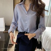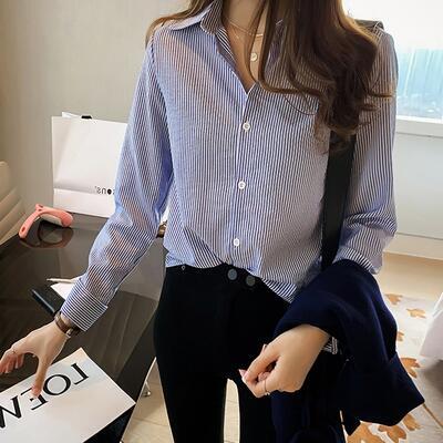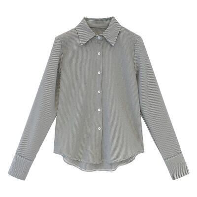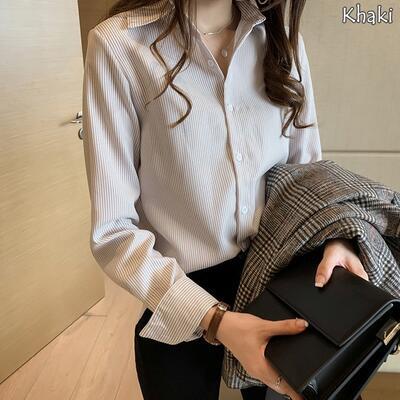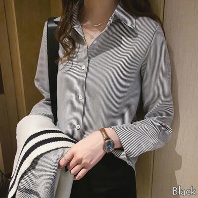 全3色 おしゃれ フェミニン エレガント 可愛い シンプル【セール クーポン利用で3390円】トップス レディース ブラウス シャツ きれいめ カジュアル 長袖 ストライプ レギュラーカラー ナチュラル オフィス 大きいサイズ ブルー 青 ブラック 黒 カーキ 春 夏 秋 20代 30代 40代 50代
