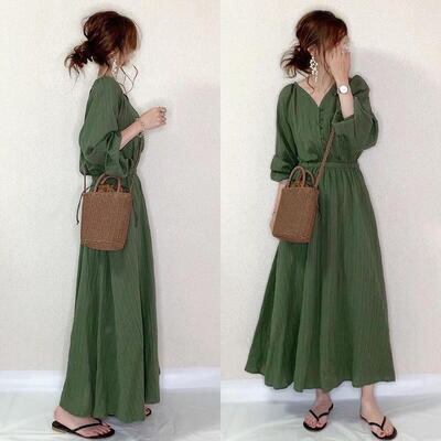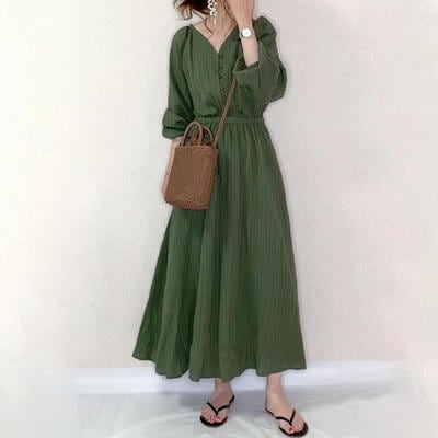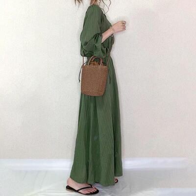 きれいめ 可愛い パフスリーブ フェミニン ワンピース エレガント カジュアル Vネック ロング丈 おしゃれ レディース ワンピ ドレス 長袖 ウエストゴム ハイウエスト リラックス ナチュラル シンプル お呼ばれ グリーン 緑 春 夏 秋 20代 30代 40代 50代