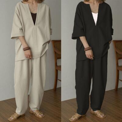 全2色 セットアップ 2点セット トップス パンツ プルオーバー レディース 五分袖 ロングパンツ カジュアル きれいめ エレガント マニッシュ テーパードパンツ かっこいい シンプル ナチュラル Vネック ベージュ ブラック 黒 春 夏 秋 20代 30代 40代 50代