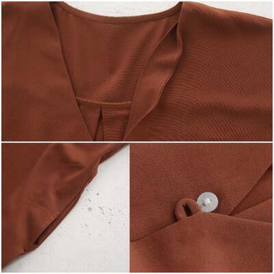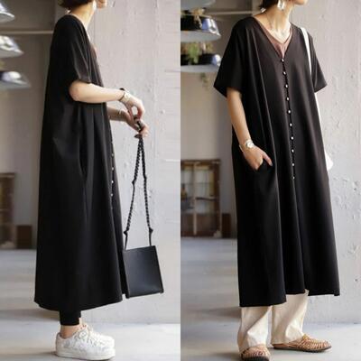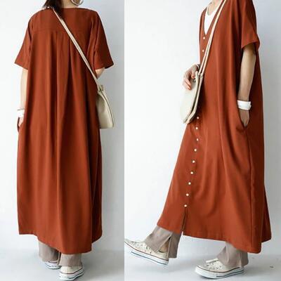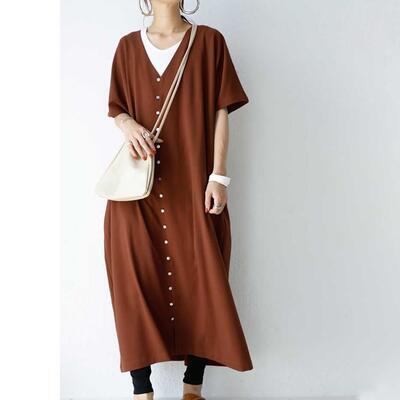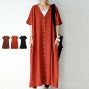 全3色 ワンピース カジュアル フロントボタン ロング丈 袖あり おしゃれ レディース 可愛い フェミニン ワンピ ドレス 半袖 五分袖 Vネック ゆったり 体型カバー きれいめ ナチュラル リラックス ブラック 黒 オレンジ ブラウン 春 夏 秋 20代 30代 40代 50代
