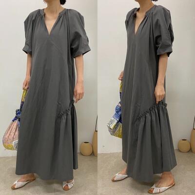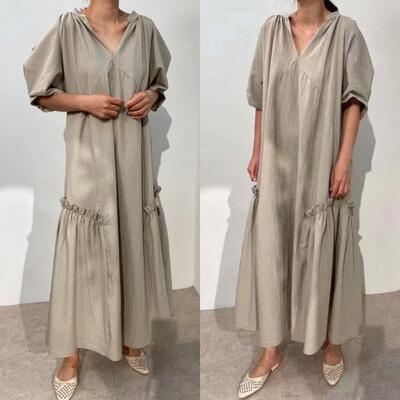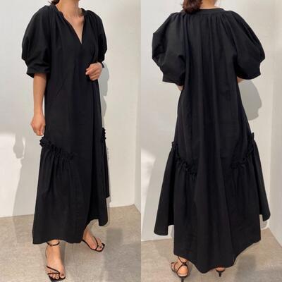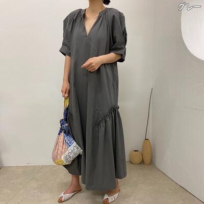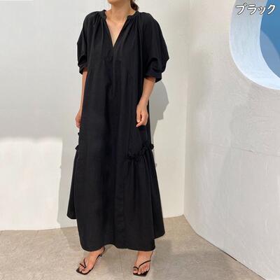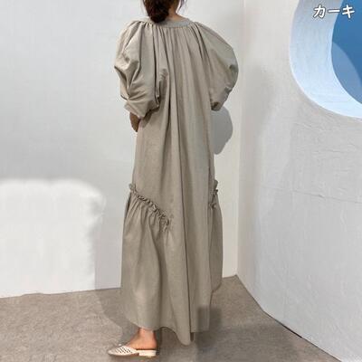 全3色 ワンピース カジュアル ロング丈 袖あり パフスリーブ おしゃれ レディース 可愛い フェミニン ワンピ ドレス 半袖 五分袖 Vネック フリル ゆったり 体型カバー きれいめ ナチュラル リラックス ブラック 黒 カーキ グレー 春 夏 秋 20代 30代 40代 50代