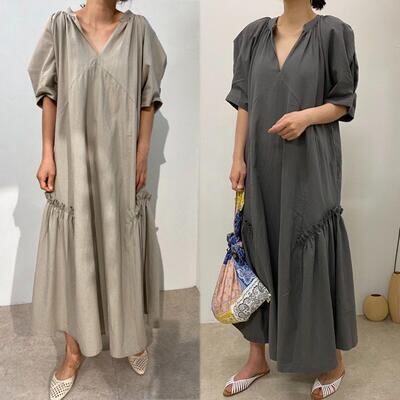 ゆったりシルエットのVネックワンピース。