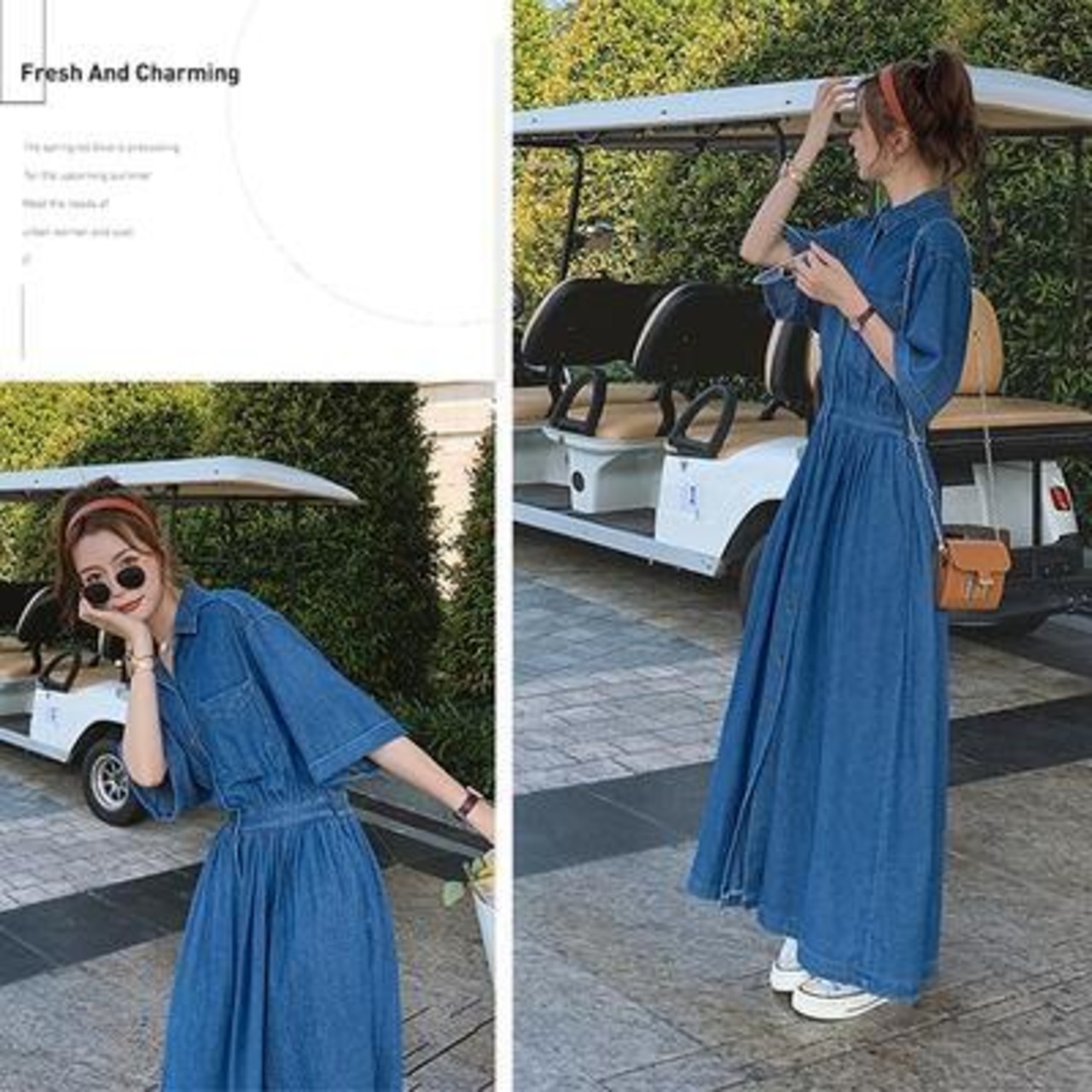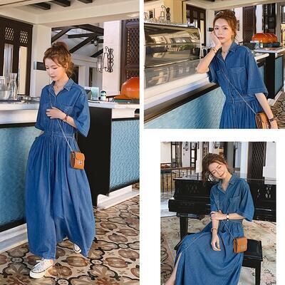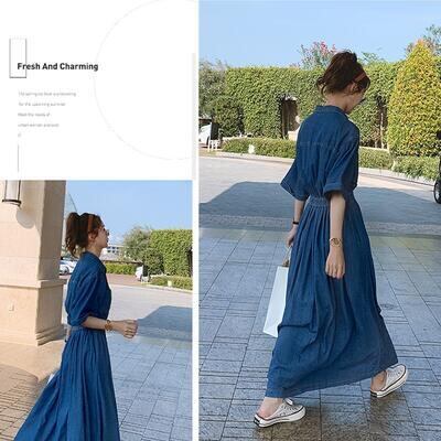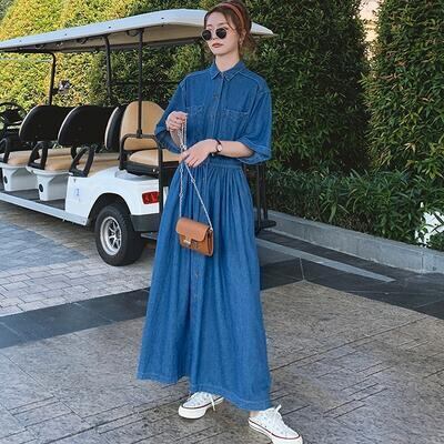 ワンピース デニム カジュアル ロング丈 袖あり おしゃれ レディース 可愛い フェミニン ワンピ ドレス 五分袖 ロングワンピ シャツワンピ きれいめ かっこいい シンプル ウエストゴム ハイウエスト 大きいサイズ ブルー 春 秋 冬 20代 30代 40代 50代