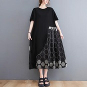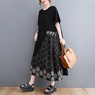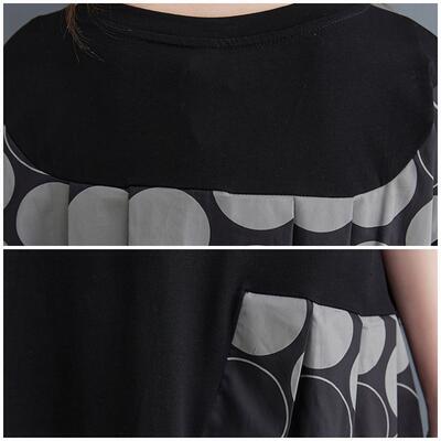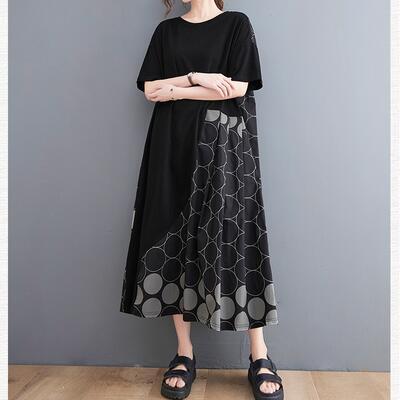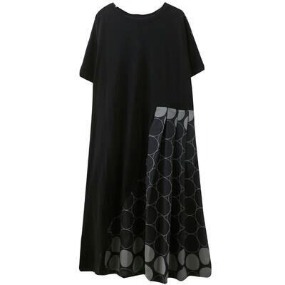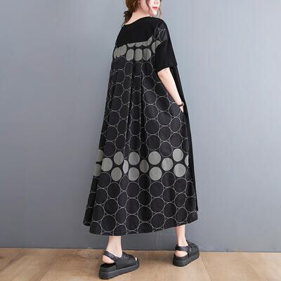 ワンピース カジュアル ロング丈 袖あり おしゃれ レディース ドット柄 可愛い フェミニン ワンピ ドレス 半袖 ロングワンピ Tシャツワンピ きれいめ かっこいい プリーツ ゆったり 体型カバー リラックス ブラック 黒 春 秋 冬 20代 30代 40代 50代