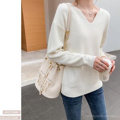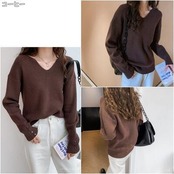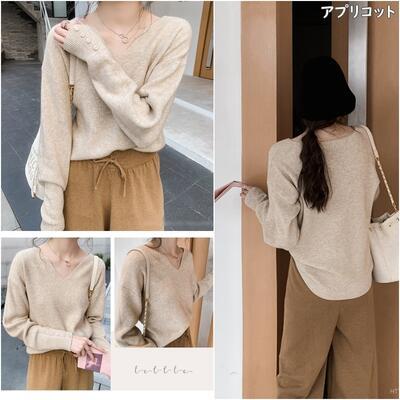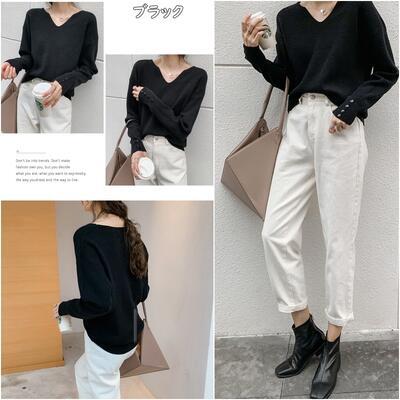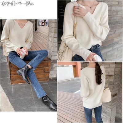 全4色 トップス レディース ニット きれいめ カジュアル 長袖 Vネック おしゃれ 可愛い かっこいい エレガント フェミニン シンプル カットソー 抜け感 ナチュラル こなれ感 オフィス ブラック 黒 ベージュ ブラウン ホワイト 白 春 秋 冬 20代 30代 40代 50代