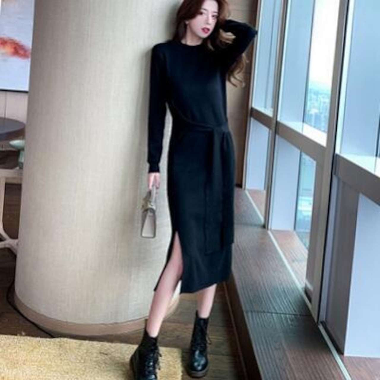 全4色 大きいサイズワンピース エレガント カジュアル ミモレ丈 袖あり おしゃれ レディース ニット ハイネック 可愛い フェミニン ワンピ ドレス 長袖 タイト ウエストリボン きれいめ ハイウエスト ブラック 黒 ベージュ レッド グリーン 春 秋 冬 20代 30代 40代 50代