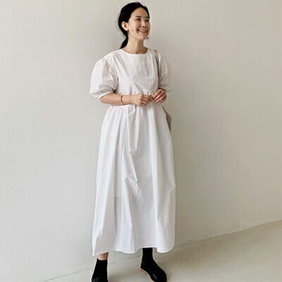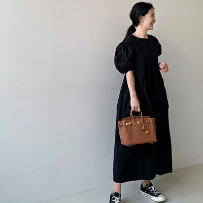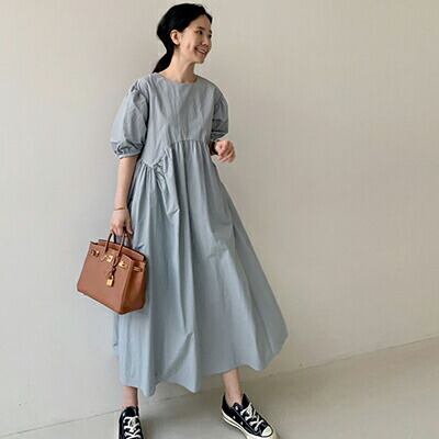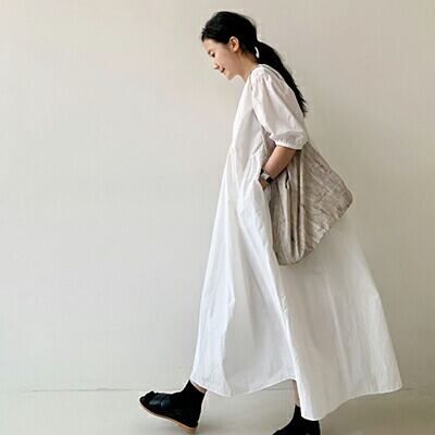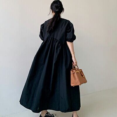 全3色 ボリューム袖 大きいサイズ コーデワンピース カジュアル ミモレ丈 袖あり パフスリーブ おしゃれ レディース 可愛い ワンピ ドレス 五分袖 ラウンドネック 森ガール ゆったり 体型カバー ロング丈 ナチュラル ブラック 黒 ブルー ホワイト 春 夏 秋 20代 30代 40代 50代 コットン 綿