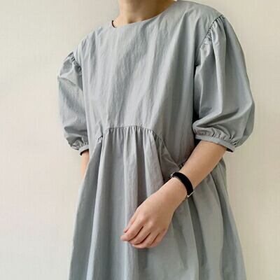 五分袖のパフスリーブとラウンドネックが優しくナチュラルな印象。